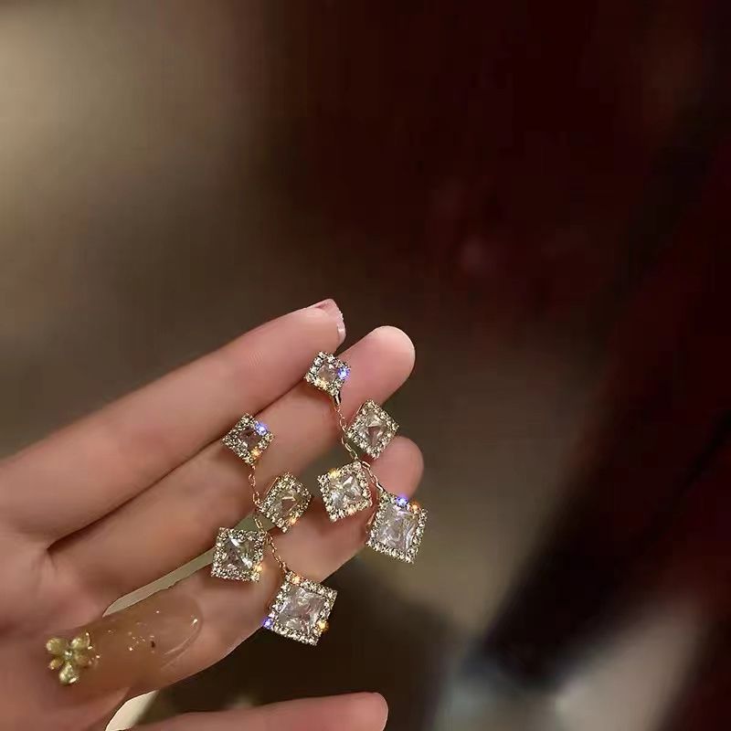 Geometric Diamond Earrings Square Micro-Inset Zircon Earrings Ice Super-Flash Block Earrings Tassel Earrings Crystal Earrings